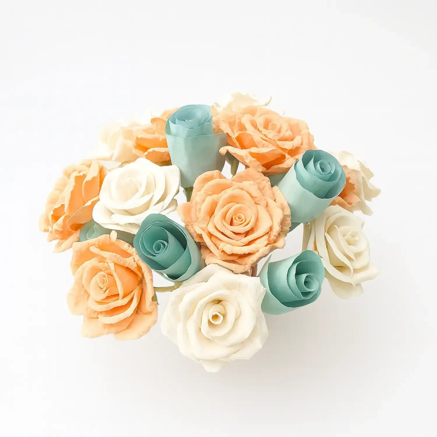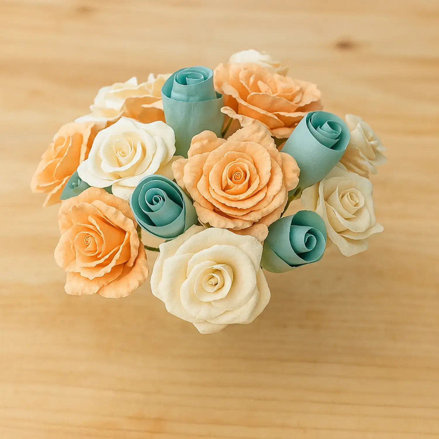 Cada pieza del ramo está elaborada a mano en tonos pasteles cuidadosamente seleccionados para transmitir suavidad y armonía. Estos colores combinan perfecto con ambientes modernos, minimalistas o clásicos, y aportan un toque romántico sin ser excesivo.